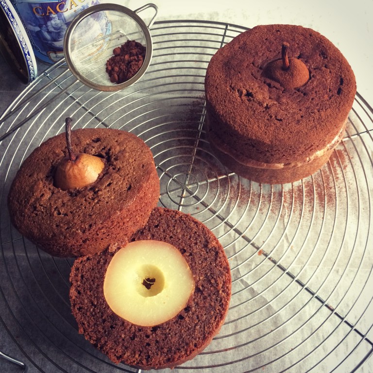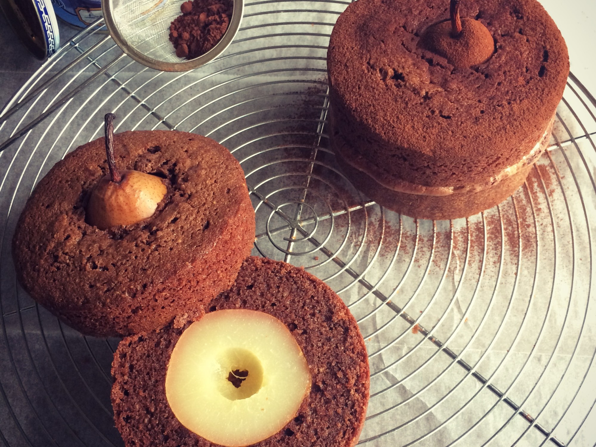 - Divide the mixture between the 2 prepared tins, then carefully put a pear in each tin and press down until almost covered.