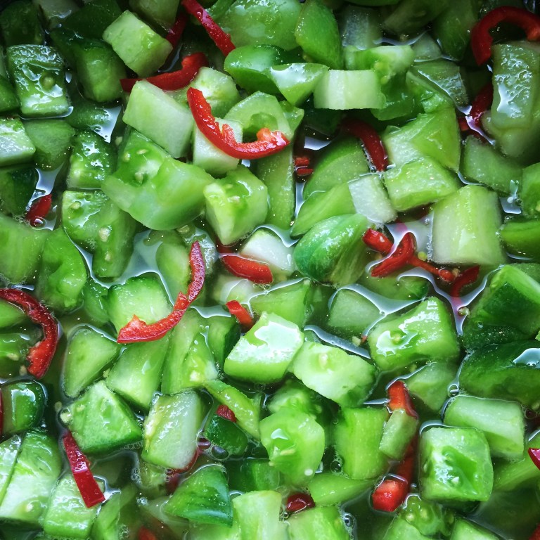 - Put in a large casserole and mix with the lemon juice, sugar and thinly sliced red chili peppers.