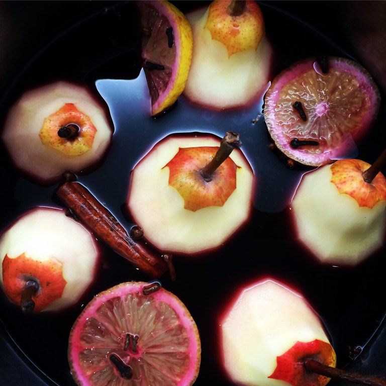 - Put them in a large pan, pour over the wine and ad the cinnamon, cloves, sugar and lemon slices.