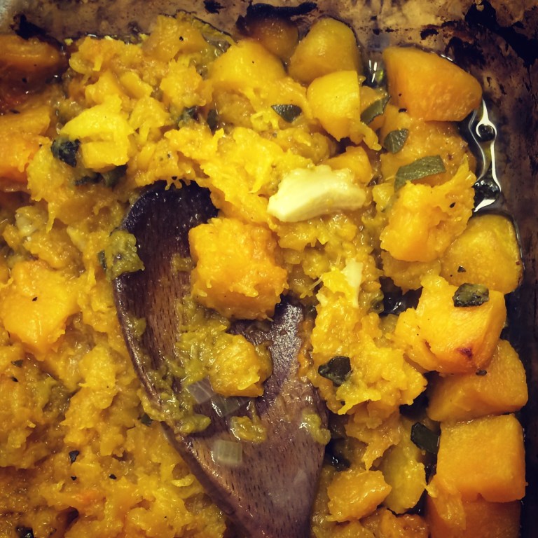 - Toss the pumpkin in the oil together with the chopped sage and the garlic.