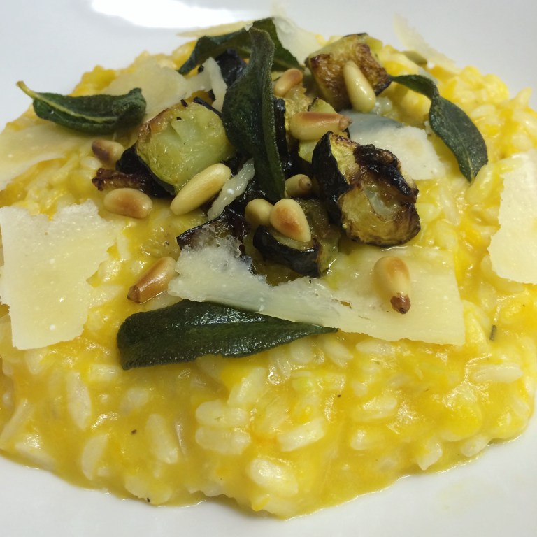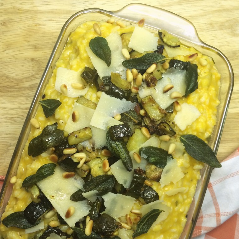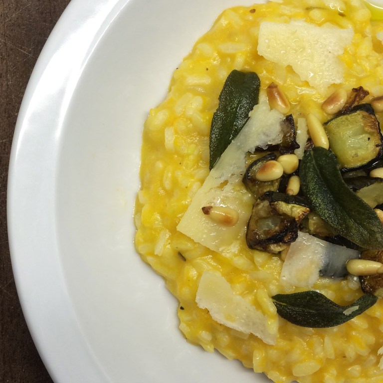 - Stir the pumpkin purée and the grated parmesan cheese through the risotto.