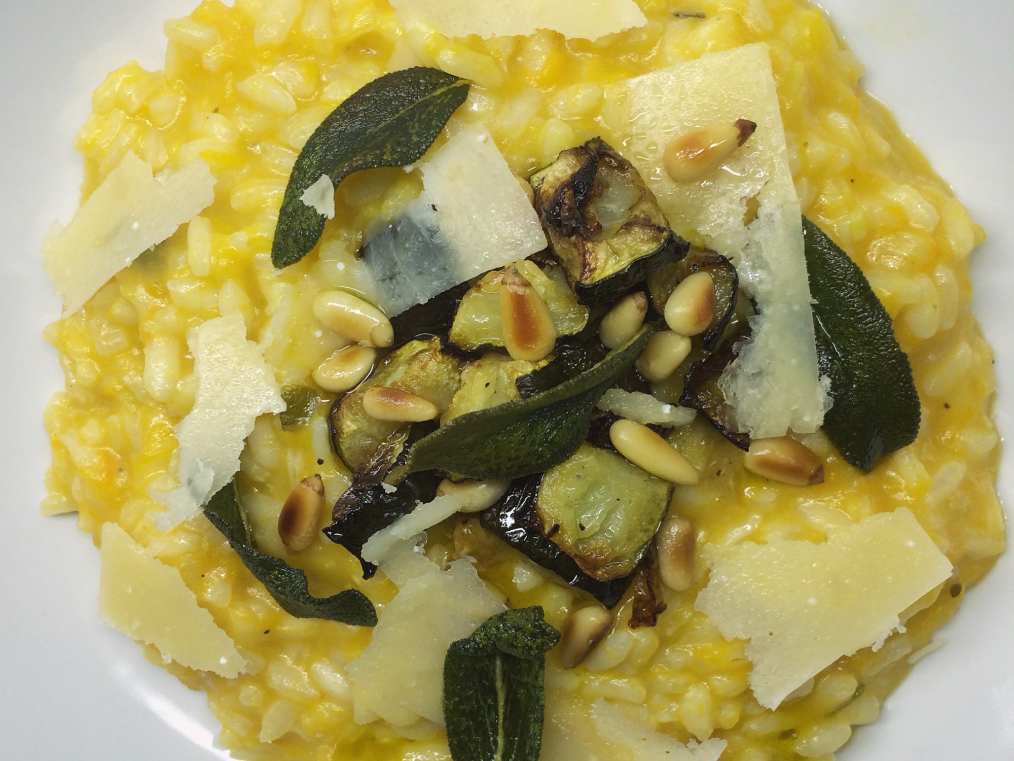 - Scatter with the chunks of zucchini, crispy sage leaves, toasted pine nuts and the reserved slivers of cheese.