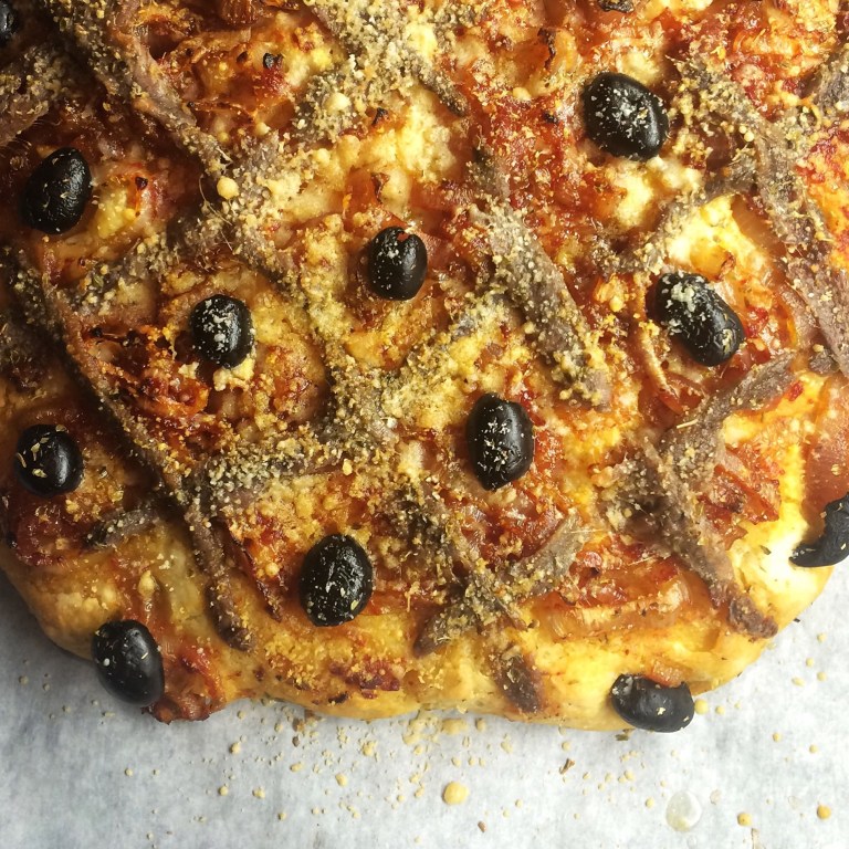 - Make a criss-cross pattern with the anchovies on top, put an olive in each square and sprinkle with the dried oregano.