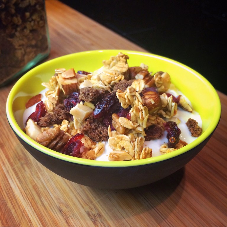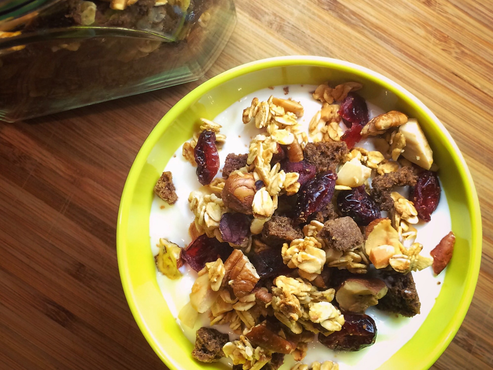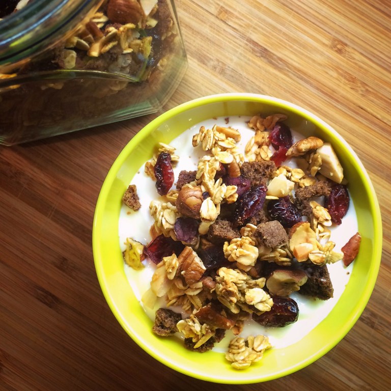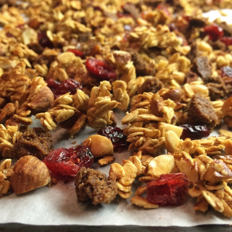 - Put the cooled granola, gingerbread crumbs and cranberries in a large bowl and toss well.