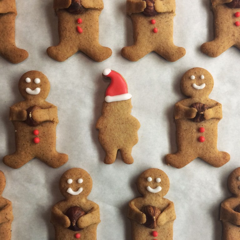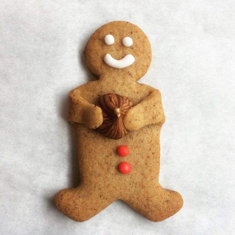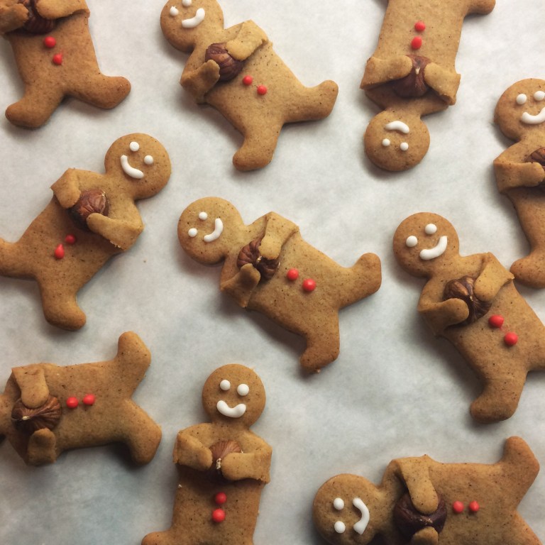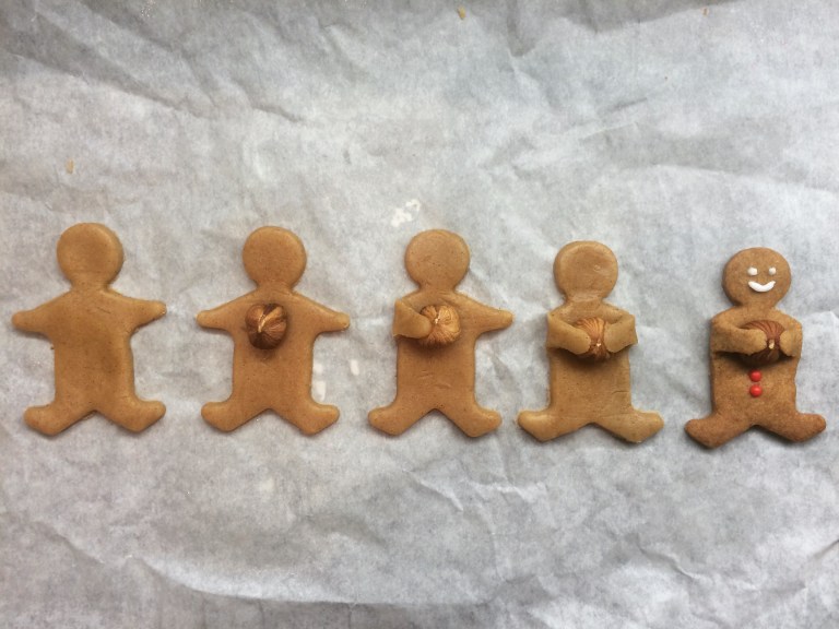 - Lift the cut out gingerbread men onto the baking sheets and place a hazelnut between the arms, then carefully fold them inwards.