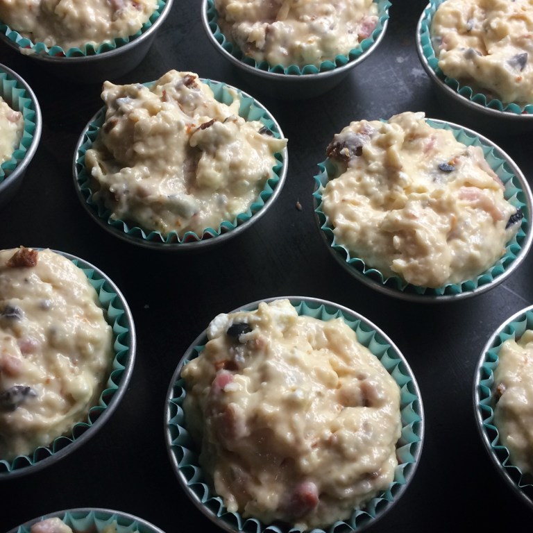 - Chop the olives and sundered tomatoes into small pieces, tip into the bowl with the batter and mix well.