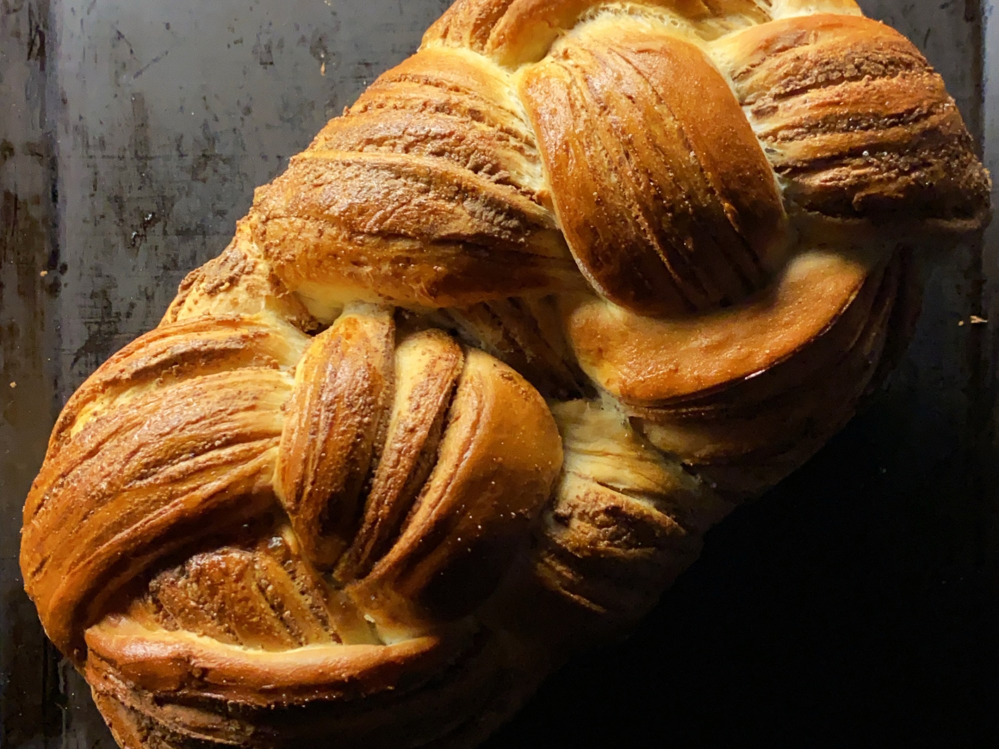 - Slice the dough coils in half lengthwise to expose the filling, then braid the 4 pieces. Cover the inside of a bread tin with baking paper. Place the braided dough in the tin, letting it curl around itself if it’s too long for the tin.